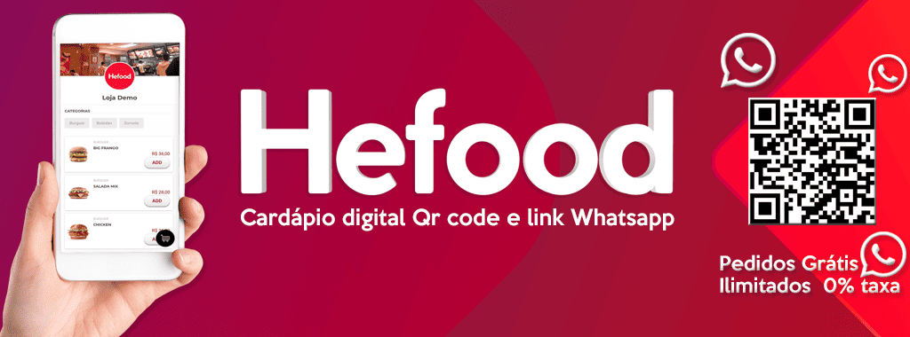 Cada loja tem um link único (ex.: hefood.com.br/loja/nomedasualoja). Divulgue no Instagram, WhatsApp e onde quiser. O cliente acessa o cardápio, seleciona os itens e envia o pedido direto para o seu WhatsApp, agilizando o atendimento e reduzindo o tempo de explicação.